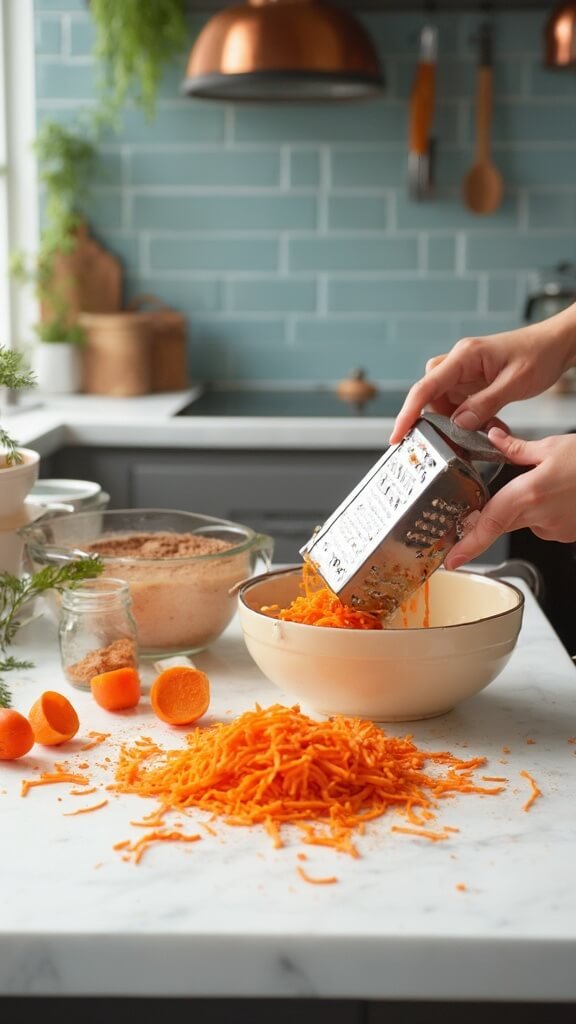 - Fold in the good stuff. Gently fold in grated carrots, nuts, and raisins with your rubber spatula. The batter should be thick but not stiff.