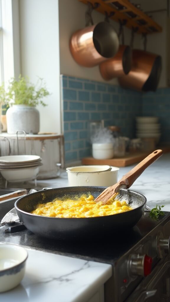 The pan should be hot enough that a drop of water sizzles immediately. - Scramble the eggs quickly, removing them when still slightly wet.