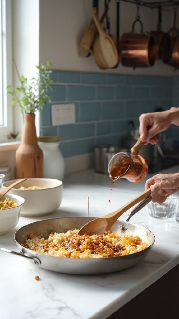 Stir-fry for 2-3 minutes without stopping. - Pour soy sauce around the edges of the pan, not directly on rice.