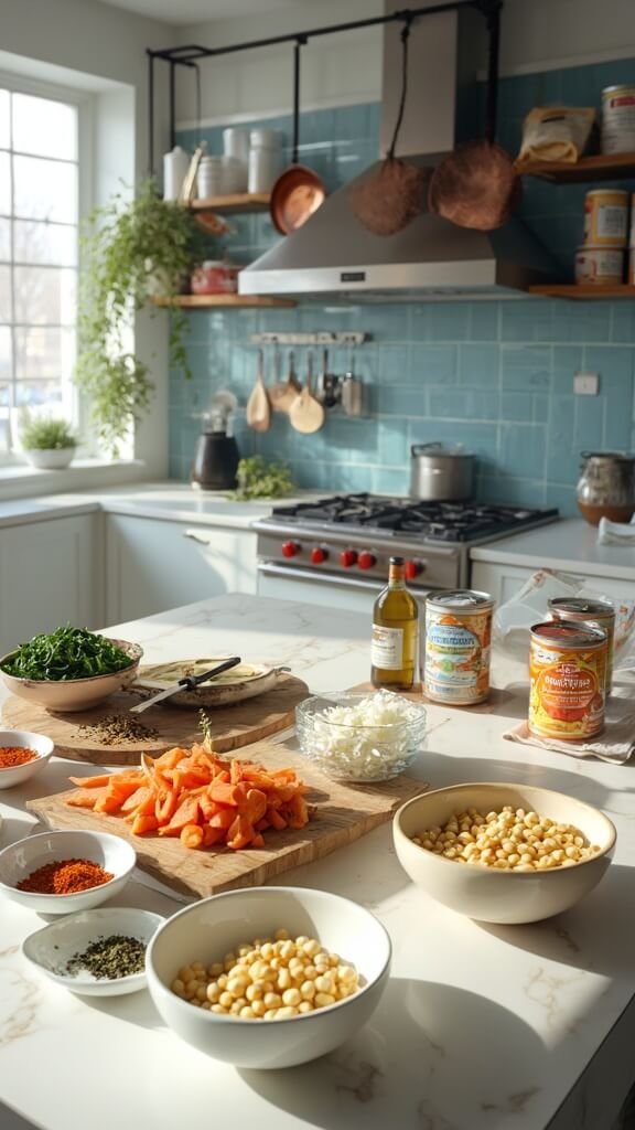 Simmering stew with chickpeas, lentils, carrots, and tomatoes; spinach leaves being stirred in, in a modern kitchen with white marble countertops and stainless steel appliances.