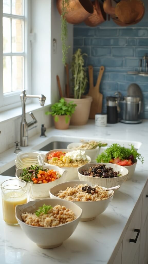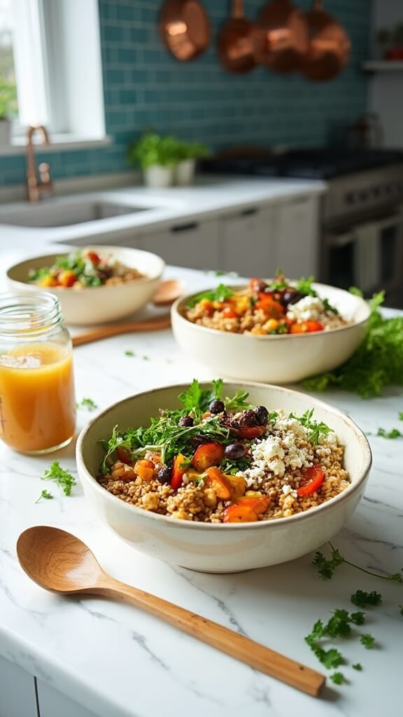 When money’s really tight, skip the olives and feta. Focus on the grain-chickpea-vegetable base with homemade dressing. You’ll still get a satisfying, nutritious meal for under $1.50 per bowl.