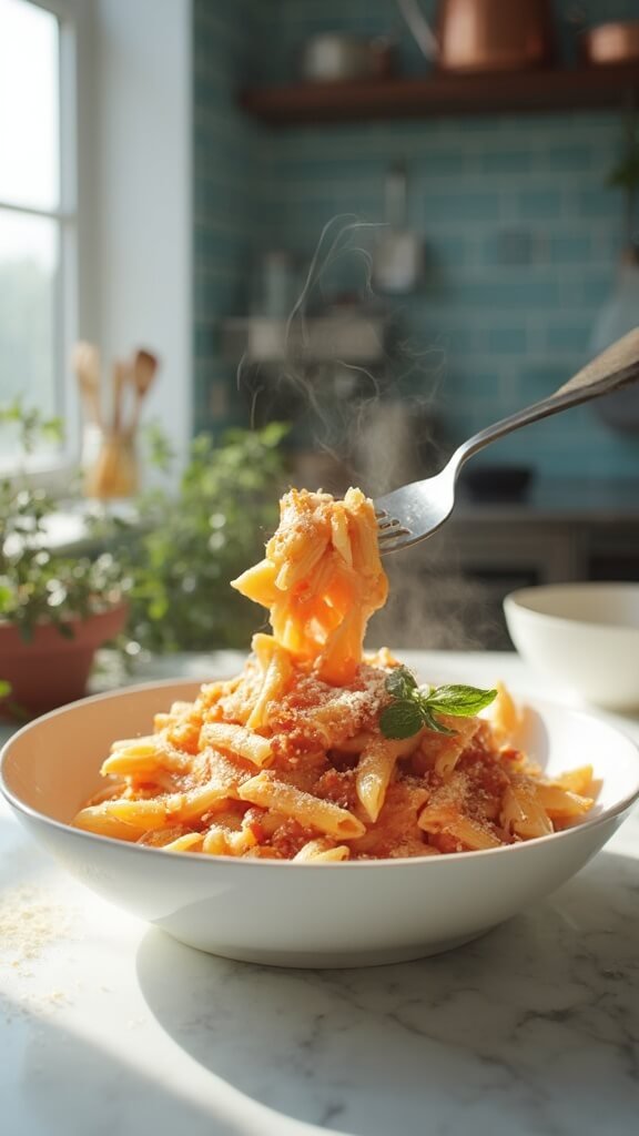 What never changes is how this simple combination of tomatoes, cream, and cheese transforms basic pasta into something that feels like a warm hug.