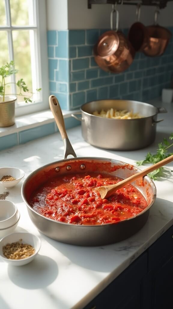 - Pour in canned tomatoes along with Italian seasoning, salt, pepper, and sugar. Let it bubble gently for 5-8 minutes until slightly thickened.