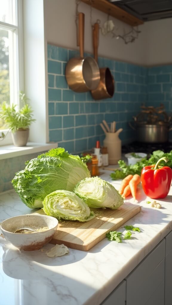 Remove the tough outer leaves and cut the cabbage in half through the core. Cut out the hard white core completely – this is crucial for good texture. - Slice the cabbage into thin shreds.
