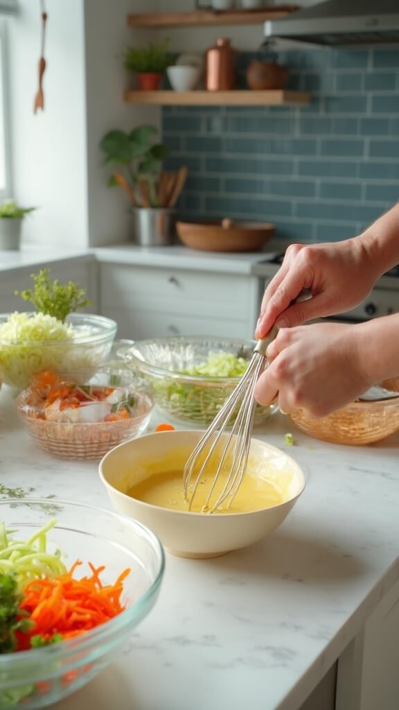 Add shredded cabbage, carrots, bell pepper, and chopped herbs. Toss gently with your hands to distribute evenly. - Dress the salad.