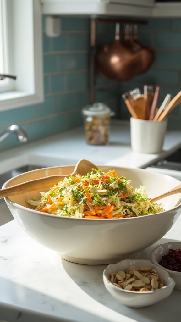 Allow the salad to sit for 10–15 minutes before serving. This lets the cabbage soften slightly and absorb the dressing. - Add final touches.