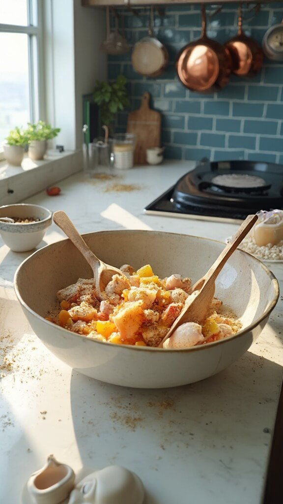 3. Combine chicken and frozen vegetables in large mixing bowl.