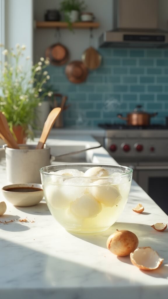 3. Immediately transfer cooked eggs to an ice bath for 10 minutes – this stops the cooking process and makes peeling easier.