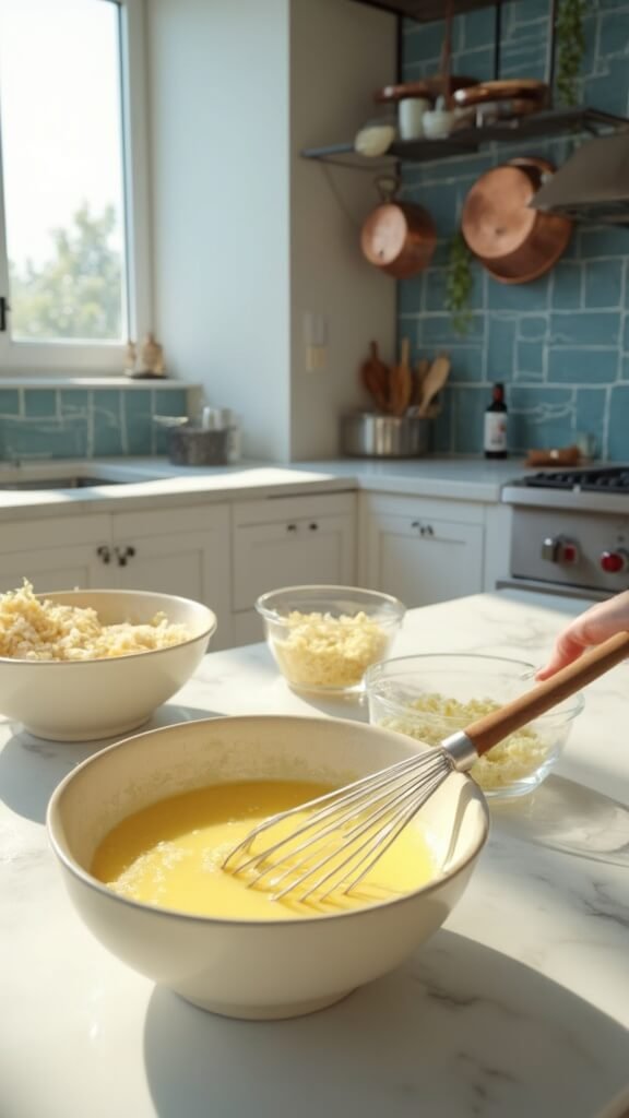 1. Crack eggs into bowl and whisk thoroughly with half the cheese, salt, and pepper until completely combined.