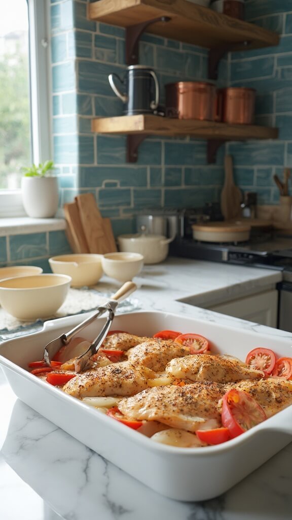6. Arrange chicken in baking dish with vegetables around edges if using.