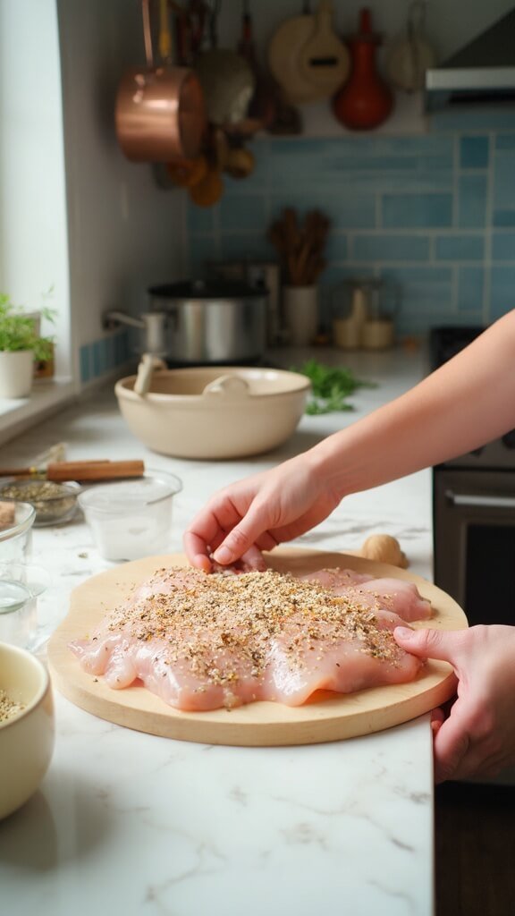 2. Pound chicken breasts to even thickness – about ¾ inch thick. This is the secret to even cooking that most people skip.